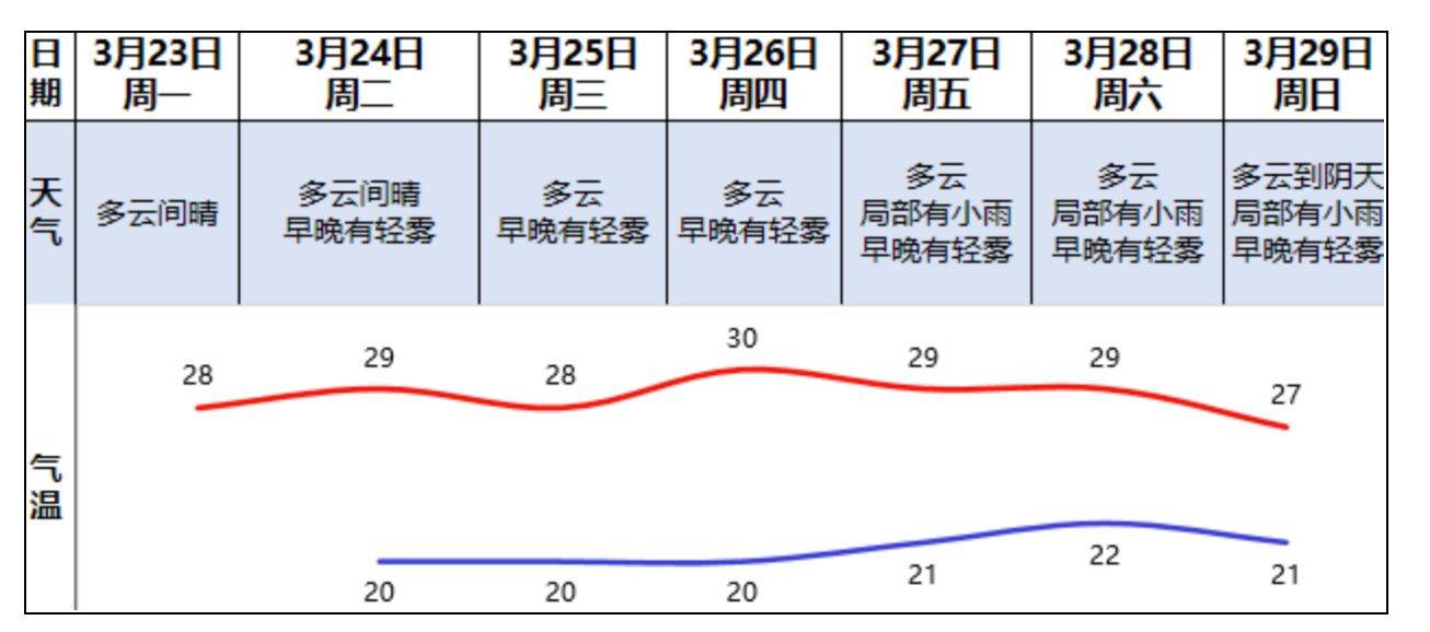 25日,多云,夙夜有轻雾,20℃到29℃;