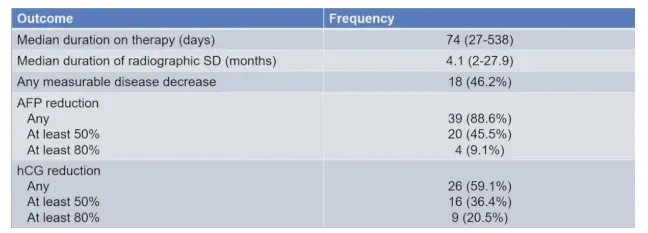 主要止境设定为临床获益率(CBR),界说为达到透彻缓解(CR)、部分缓解(PR)或疾病通晓(SD)且抓续技能≥3个月的患者比例,依据实体瘤疗效评价模范(RECIST 1.1)进行评估,并极端针对生殖细胞肿瘤脾气进行了改变,纳入甲胎卵白(AFP)和东说念主绒毛膜促性腺激素(hCG)等血清肿瘤绚烂物的变化。