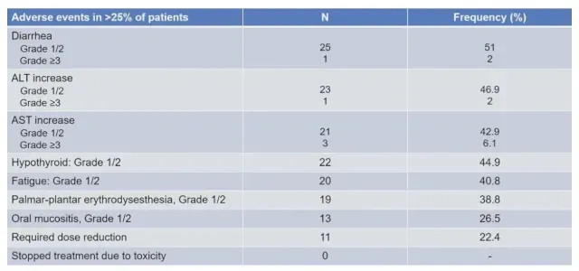 总体而言,卡博替尼的不良事件谱与通例用于生殖细胞肿瘤的细胞毒性化疗类似度较低,未不雅察到显耀的骨髓禁锢、神经毒性或肾毒性,这关于已接收多线铂类化疗、器官功能储备着落的患者群体尤为贫寒。