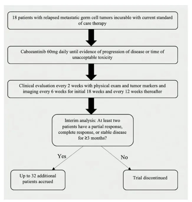 本磋磨是一项选择Simon两阶段计算的单臂Ⅱ期临床测验,旨在评估卡博替尼口服休养在不成诊治的复发/难治性生殖细胞肿瘤患者中的临床活性与安全性。