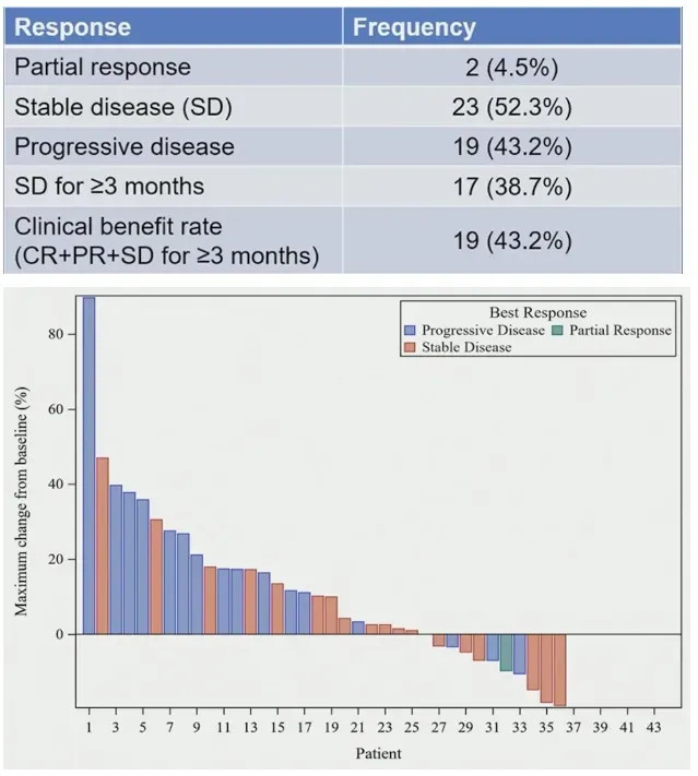 主要止境临床获益率达到43.2%(19/44),其中部分缓解率4.5%(2/44),疾病通晓率38.6%(17/44),且通晓抓续技能均≥3个月。未见透彻缓解病例。这一收尾虽未达传统细胞毒性化疗在明锐复发患者中的缓解率水平,但接洽到入组患者均历程多线休养且为公认不成诊治东说念主群,跳跃四成的疾病结果率仍具有临床意念念。