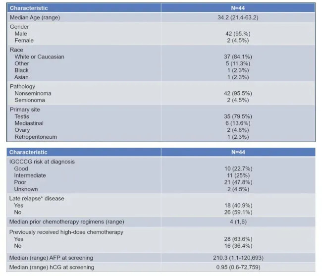 Simon第一阶段既定指标达成,磋磨顺利推广至第二阶段,最终共有44例患者纳入疗效分析,其中女性患者2例。入组患者的中位年纪为34.2岁(领域:21.4-63.2岁),95.5%(42/44)为非精原细胞瘤,这一踱步与复发难治性东说念主群中非精原细胞瘤占主导的临床特征相符。原发肿瘤部位踱步为:睾丸79.5%,纵隔13.6%,卵巢4.6%,腹膜后2.3%。把柄海外生殖细胞肿瘤相助组(IGCCCG)预后分层,初诊时风险景色踱步为:致密22.7%,中等25%,差47.8%,未知4.5%,华体会体育辅导该队伍举座预后风险偏高。值得提防的是,40.9%(18/44)的患者为晚期复发,即一线休养透彻缓解后跳跃两年复发,这类患者时常对拯救化疗明锐性较低。休养史方面,患者既往接收化疗决议的中位数为4线,63.6%曾接收高剂量化疗连合外周血干细胞移植,印证了该东说念主群"重度预处理"的特征。基线肿瘤绚烂物水平裸露中位AFP为210.3 ng/mL(领域:1.1-120,693),中位hCG为0.95 IU/L(领域:0.6-72,759),绚烂物水平各异悬殊,反应了肿瘤生物学行动的异质性。