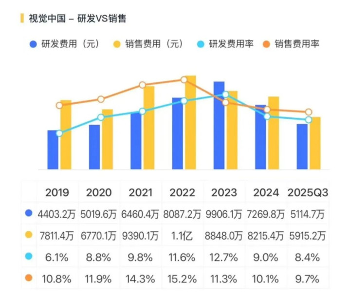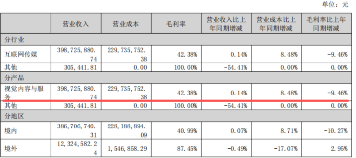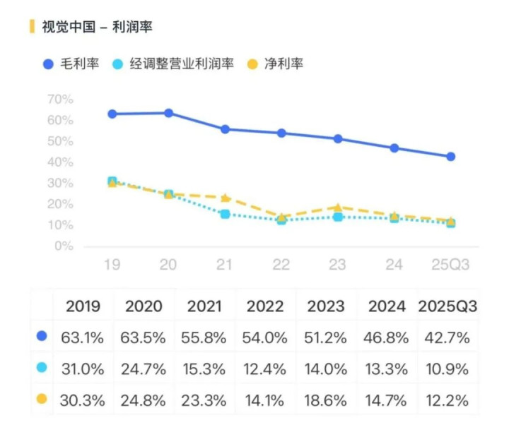 赢利才能的下跌在毛利率上体现得尤为昭彰。2025年上半年,中枢业务“视觉内容与就业”毛利率为42.4%,同比下滑了9.5个百分点。