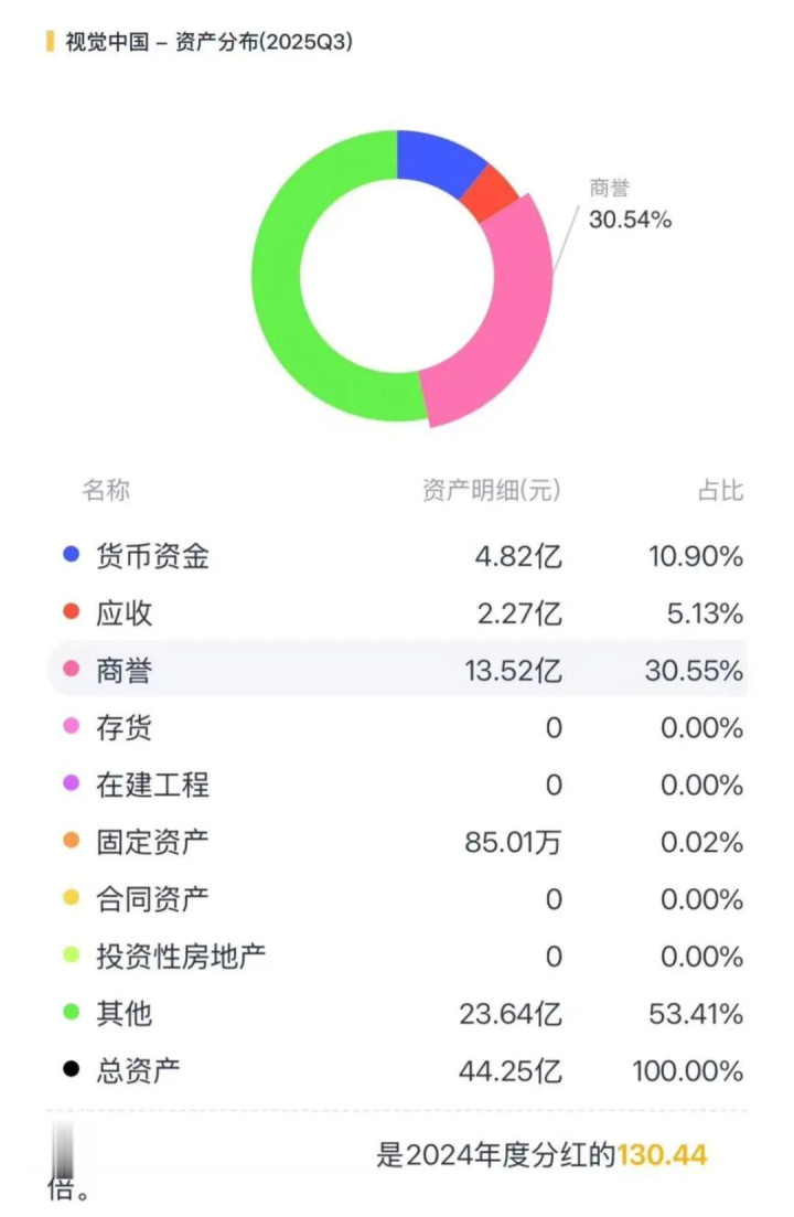 自2014年借壳上市后,视觉中国便通过一系列高溢价收购膨伟业务疆土,蓄积了海量独家版权素材,这些金钱组成了公司极高的商誉。2025年三季度末,其商誉金钱高达13.5亿元,占其总金钱的30.6%。