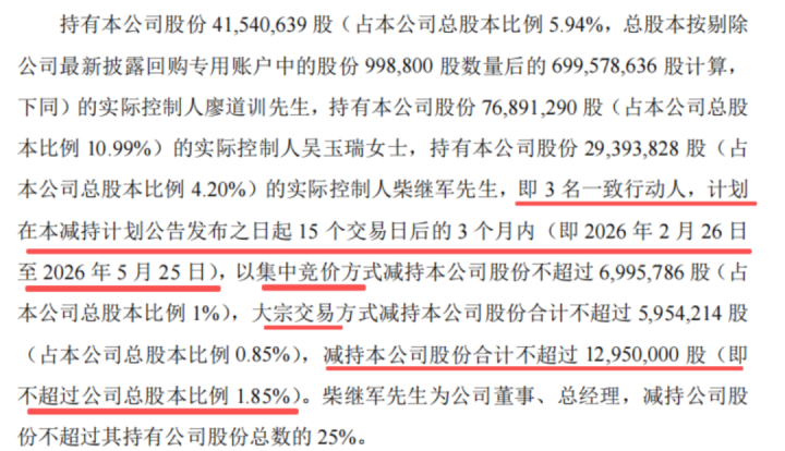 2026年1月28日,公司发布的《对于实践截止东说念主减持公司股份的预表现公告》浮现,廖说念训、吴玉瑞、柴继军三东说念主因自己资金需求研讨在2026年2月26日-2026年5月25日,通过辘集竞价和大量往返的式样整个减持公司不超越1295万股(占公司总股本的1.85%)股份。届时,得手几个小见解不成问题。