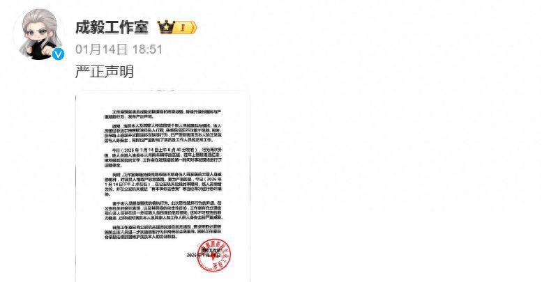 1月14日,成毅责任室发布严正声明,称演员成毅相称家东说念主近期握续遭遇个别东说念主员的追踪与杂沓词语,该东说念主员通过违纪本事获取其私东说念主行程,并扩充尾随、围堵、试图逼泊车辆等作为。