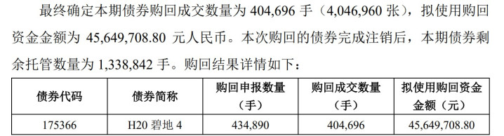 “H20碧地4”总共购回讲述数目为434,890手(4,348,900张)。凭据本次购回的购回总金额及总共购回讲述数目细目分拨比例93.07%(精准到0.01%),并按照等比例原则细目每一位讲述登记的方向债券握有东说念主获配的购回金额及购回数目(如存在余数起火一手的情况,则接受舍尾取整的神气辩论),未成交的登记购回债券已由本公司朝上海证券往返所、中国证券登记结算有限公司上海分公司提议驱除央求。