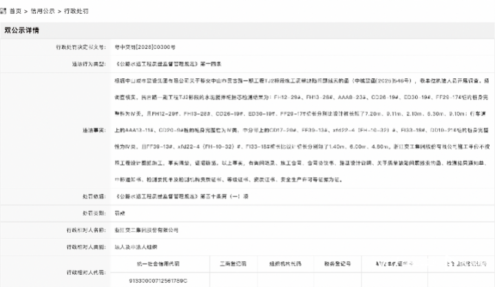 日前,信用中国公布了对于浙江交工集团股份有限公司(以下简称“浙江交工”)的行政处罚决定。浙江交工因施工单元不按照工程筹办图纸施工,被中山市交通运输局罚金756.40453万元。