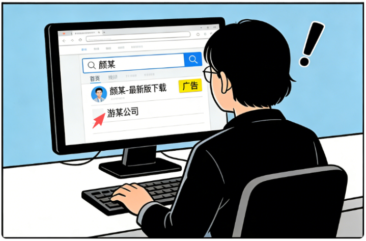 数某公司无意发现,用户在某大型搜索引擎搜索“颜某”时,首页显明出现带有“告白”璀璨的“颜某-最新版下载”贯穿,下方却标注着游某公司平台称号,点击后平直跳转至APP下载页面。