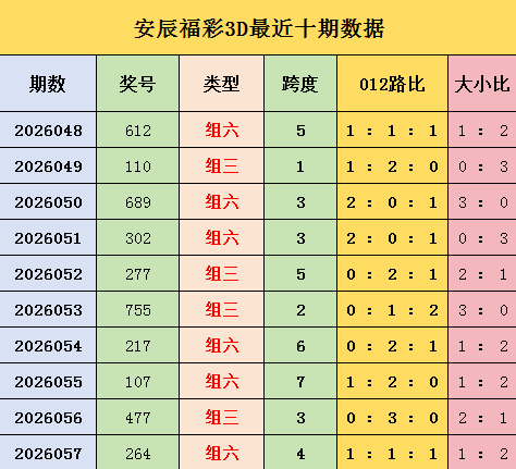 一、类型分析:上期开出奖号264,为组六类型,最近十期组六类型奖号共出现6次,区别开出 612 689 302 217 107 264.其中组三号码出现4次。概述分析,组六类型较热,本期预测开出组六号码。