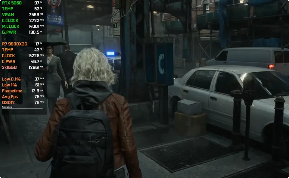 平均帧速为75 FPS,最低瞬时帧速为61 FPS,帧时间为12.8ms,CPU使用率为17%,功耗为47W,温度为43℃,内存使用量为13.0GB,GPU使用率为97%,显存使用量为7.6GB,功耗为131W,温度为53℃。