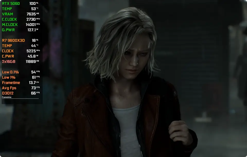 平均帧速为73 FPS,最低瞬时帧速为61 FPS,帧时间为13.7ms,CPU使用率为18%,功耗为46W,温度为44℃,内存使用量为11.9GB,GPU使用率为100%,显存使用量为7.6GB,功耗为127W,温度为53℃。