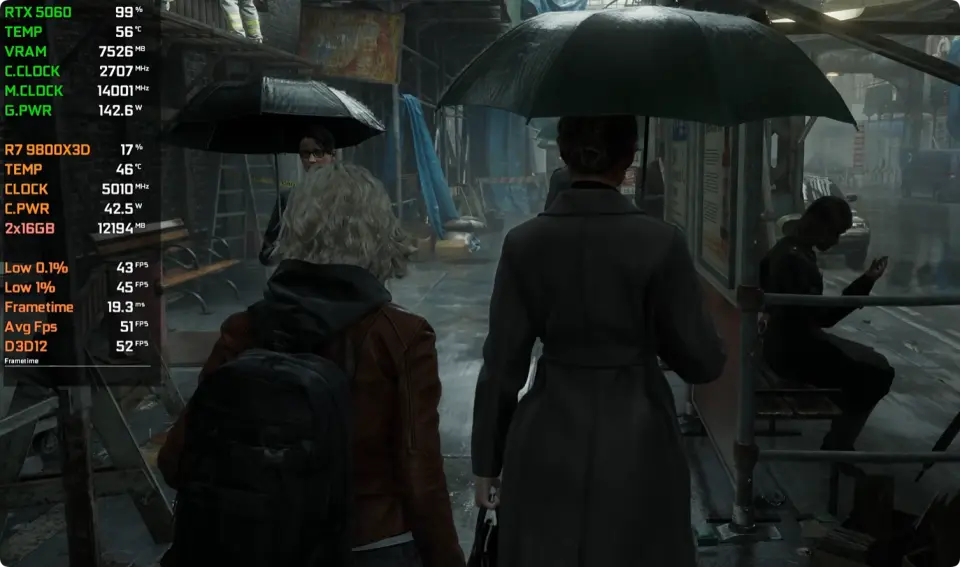 平均帧速为51 FPS,最低瞬时帧速为45 FPS,帧时间为19.3ms,CPU使用率为17%,功耗为43W,温度为46℃,内存使用量为12.2GB,GPU使用率为99%,显存使用量为7.5GB,华体会体育功耗为143W,温度为56℃。