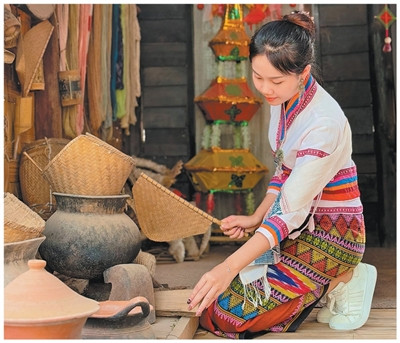 身着老挝传统衣饰的妇女在“萤火工坊”体验纺织工艺。